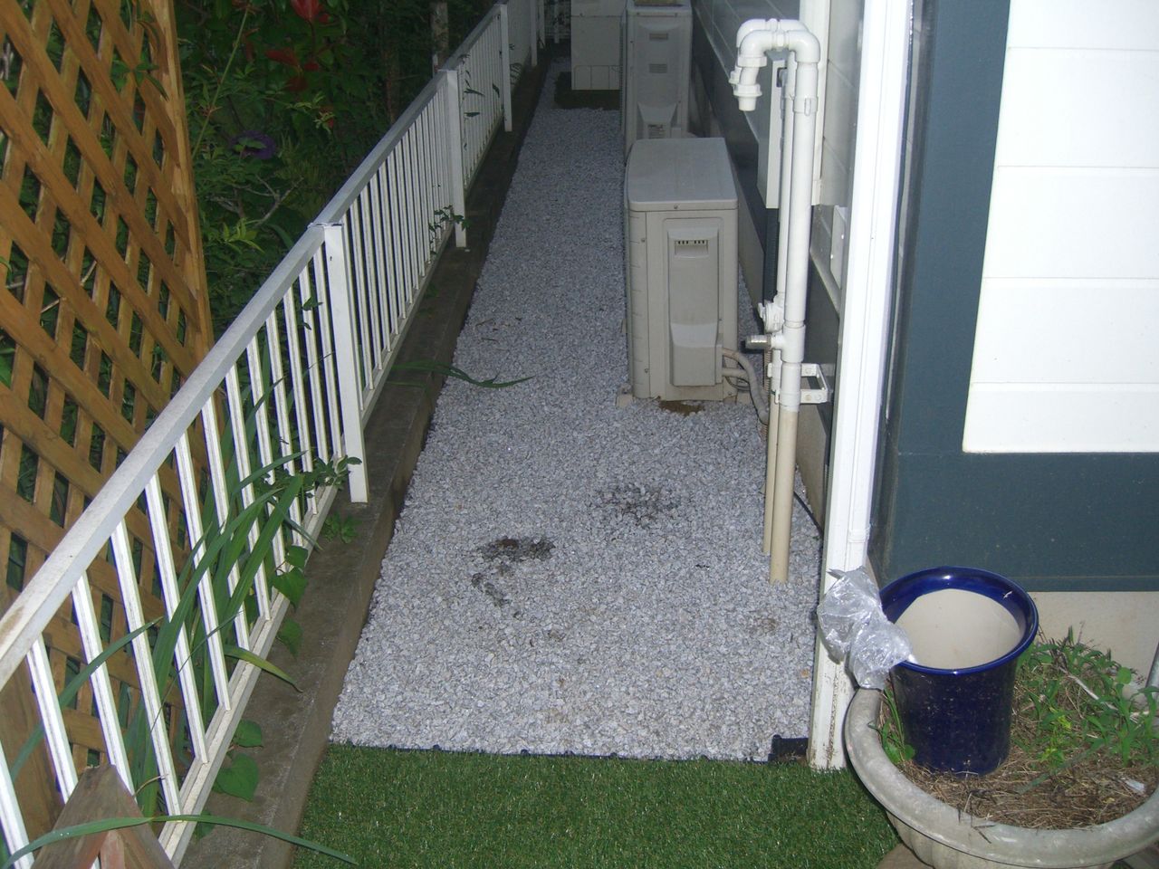 既存アプローチの延長で裏の物置までのアプローチ、外周及びサンルーム下の砂利敷き、